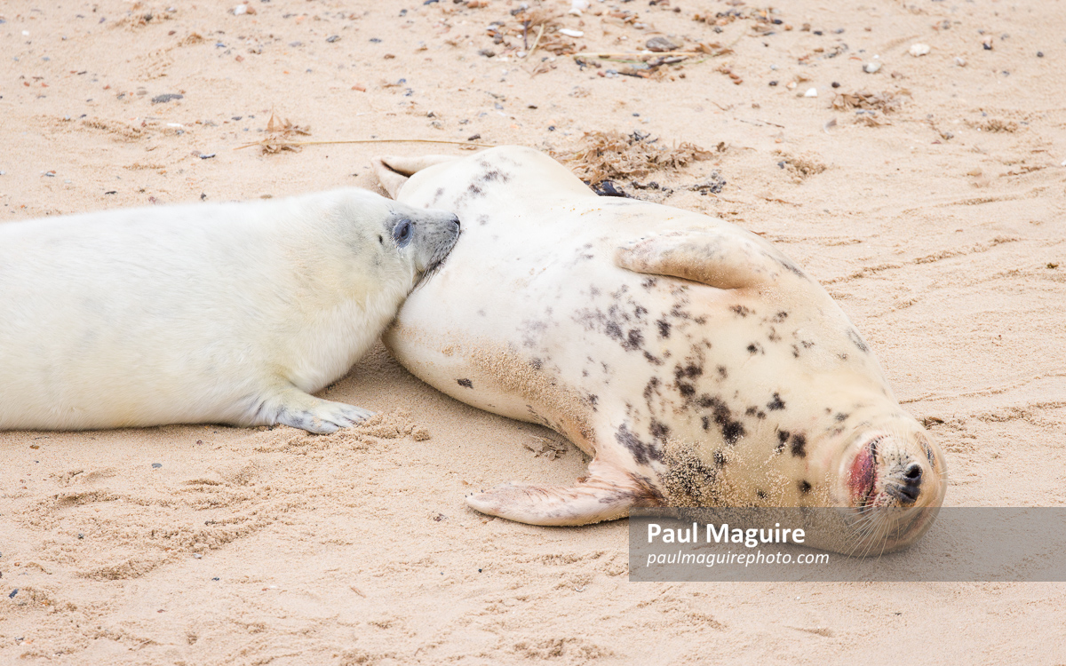 Grey seal pup suckling from mother at Horsey Gap, Norfolk, UK