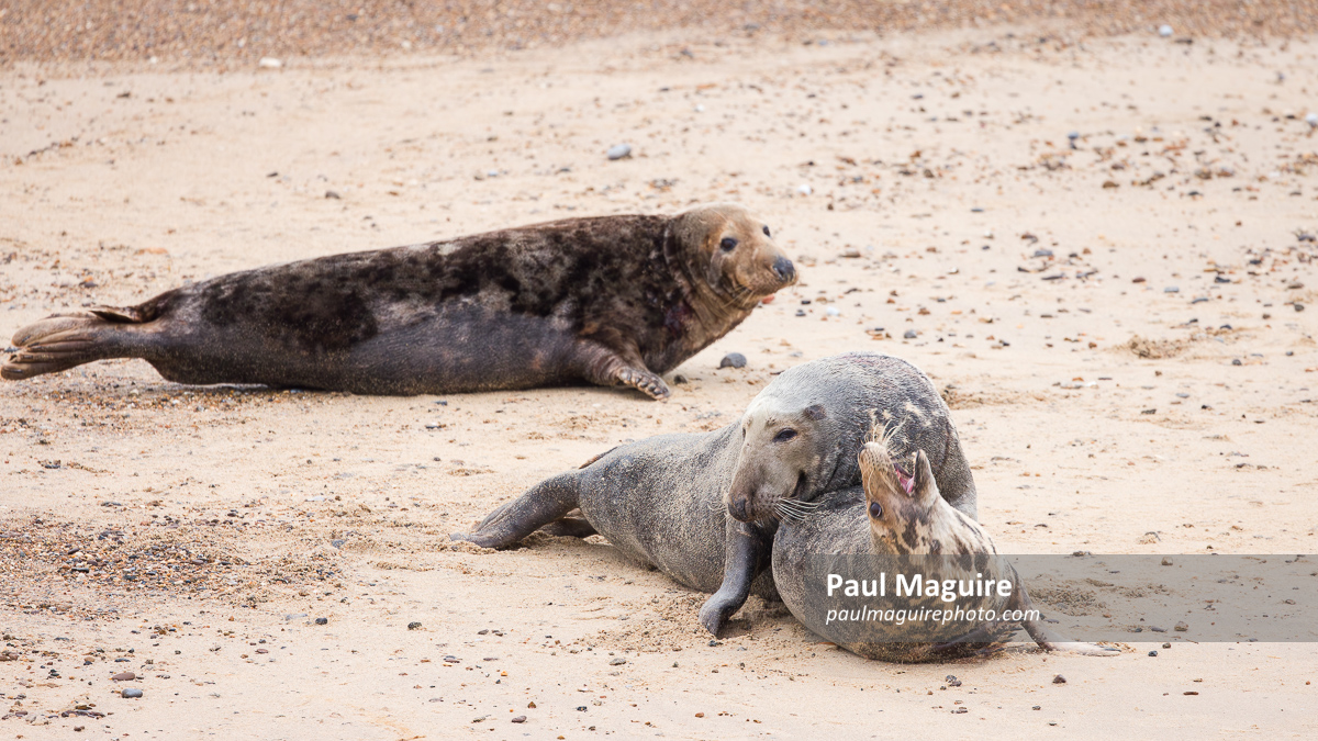 Two adult grey seals (Halichoerus grypus) mate while a rival male looks on. On the beach in winter, Horsey Gap, Norfolk, UK: coast,coastal,europe,britain,british,british isles,great britain,uk,england,norfolk,english,united kingdom,european,north sea,sea,beach,environment,nature,nature reserve,northern,outdoor,outdoors,shore,winter,wintertime,wintry,animal,mammal,phocidae,pinniped,pinnipeds,seal,seals,mammals,animals,atlantic seal,earless seal,gray seal,gray seals,grey seal,grey seals,halichoerus grypus,horsehead seal,true seal,colonies,colony,aquatic,habitat,lying,marine,portrait,protected,breed,breeding,mate,mating,baring teeth,mouth,open,teeth,black,dark,fur,sand,sandy,beauty,wild,conservation,behavior,behaviour,endangered,species,3,three,no-one,no one,no people,nobody,noone,horsey gap,adult,adults,cow,cows,female,females,males,bull,bulls,male,wildlife,grey,gray