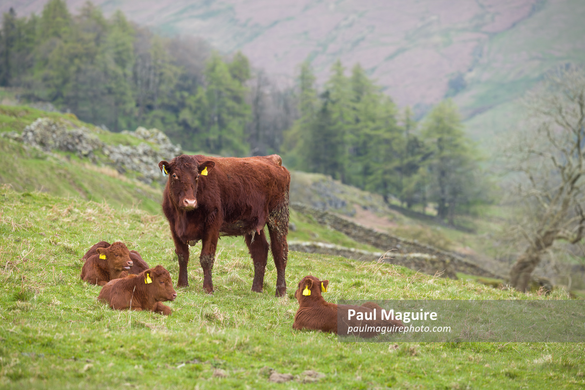 Luing cattle, portrait of a Luing cow with calves in a field in the Lake District, Cumbria, UK: calf,calves,cattle,cow,cows,breed,europe,britain,british,british isles,great britain,uk,england,cumbria,lake district,english,united kingdom,european,livestock,luing,luing cattle,highland,upland,highland cattle,highland cow,highland cows,upland cattle,animal,animals,portrait,female,beef,landscape,countryside,field,outdoors,summer,spring,hill,hillside,rural,scene,agriculture,farming,farm,nobody,scenic,country,nature,farmland,agricultural,outside,herd,scenery,pasture,meadow,view,brown,red,rustic,fields,hills,grass,steer,farms,young,outdoor,looking at camera,beef cattle,ranch,adult,land,rearing,mother