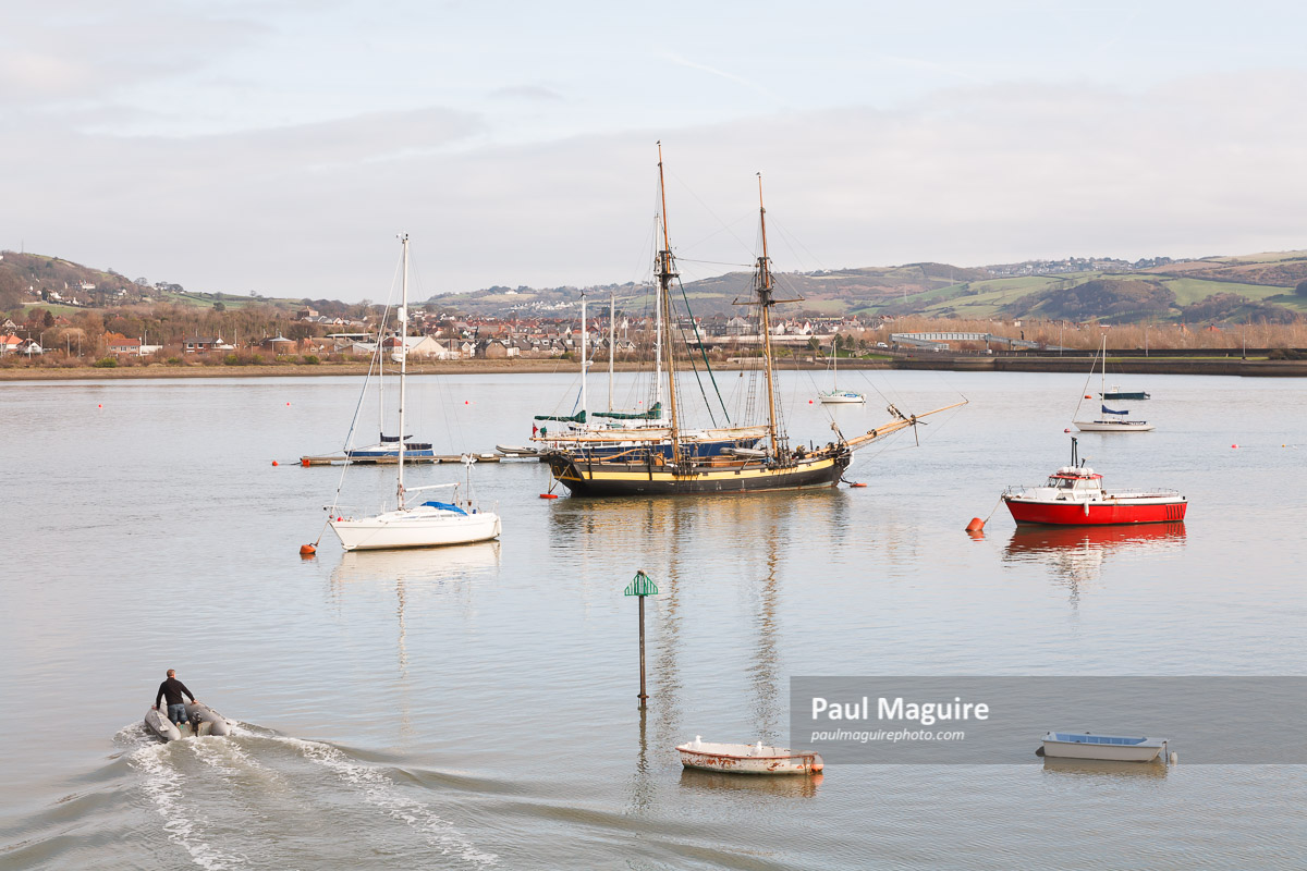 A man steers a dinghy on River Conwy toward boats moored at Conwy historic town in North Wales: europe,britain,british,british isles,great britain,uk,wales,conwy,welsh,united kingdom,european,cities,city,town,towns,scene,scenery,scenes,scenic,scenics,view,vista,landscape,landscapes,attraction,coast,destination,england,english,harbour,historic,holiday,nature,north wales,tourism,tourist,tourists,travel,vacation,bay,beautiful,blue,boat,boats,coastal,harbor,moored,ocean,oceans,port,river,rivers,sail,sailing,sea,seascape,seaside,ship,ships,shore,sky,summer,vacations,water,yacht,yachts,maritime,nautical,dinghy,male,man,men,people,person,marina,quay,coastline,sailboat