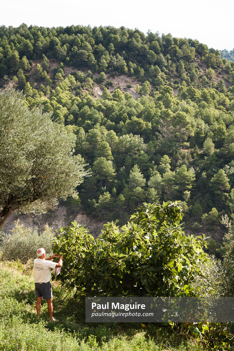 Man picking figs from a fig tree in Spanish countryside, Aragon, Spain: europe,spain,aragon,spanish,european,destination,destinations,landmark,landmarks,place,places,travel,landscape,landscapes,scene,scenery,scenes,scenic,scenics,view,vista,viewpoint,hill,hills,tree,trees,countryside,rural,fig tree,figs,fig,fruit,picking,growing,pick,grow,agriculture,agricultural,country,detail,farm,farmland,fields,field,garden,green,nature,man,person,people,old,senior,older,mature,men,rustic,traditional,plants,outdoors,lifestyle,farmer,worker,working,work