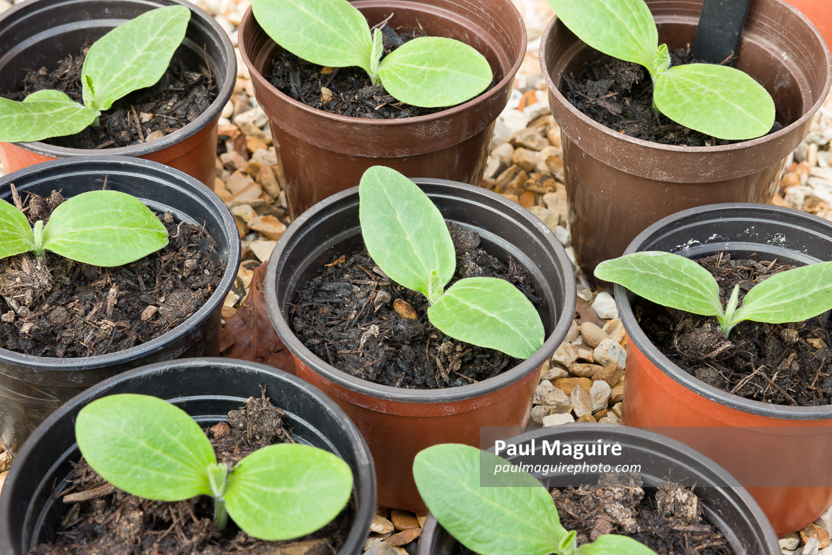 Young zucchini plants (courgettes) growing in pots. Vegetable seedlings, UK: courgette,seedlings,growing,courgettes,plants,sowing,vegetables,seeds,pot,pots,flower pot,plant pot,garden,plant,uk,vegetable,gardening,outdoors,zucchini,home grown,young,grow,organic,spring,springtime,grown,planting,soil,food,cultivating,cultivation,seed,outside,homegrown,nobody,horticulture,england,english,planter,plantpot,sprouting,new,beginning,small,green,nature,seedling,sprout,growth,ground,potting,sow,sown,closeup,close up