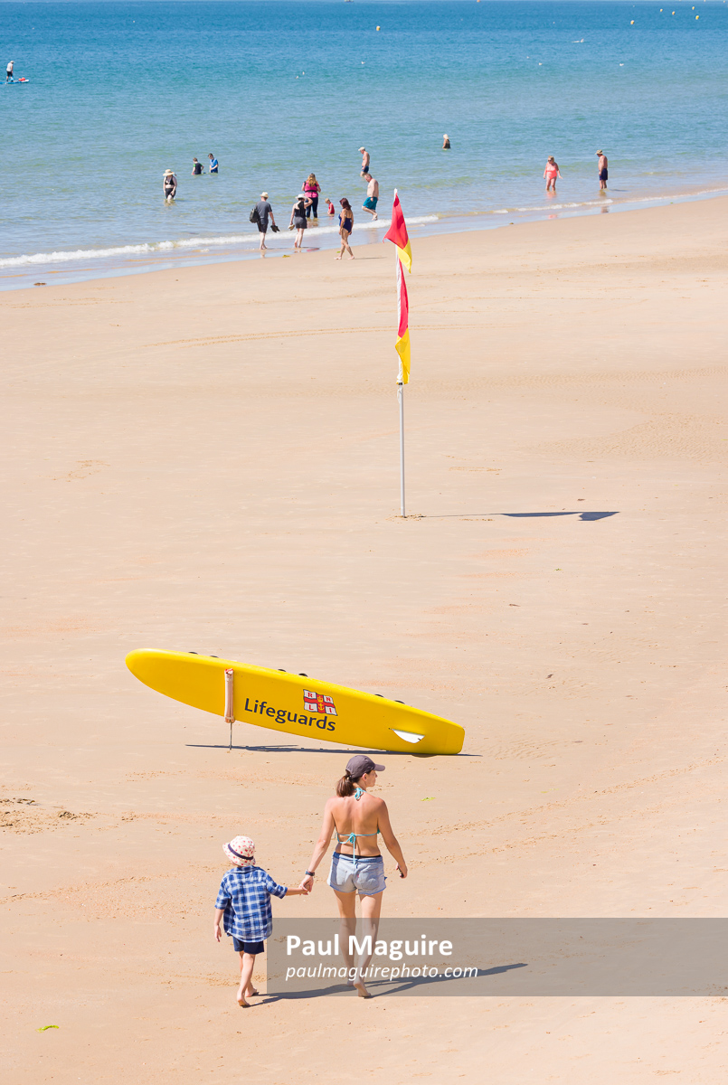 Woman and child walk on Bournemouth beach toward an RNLI lifeguard surfboard: people,person,tourism,tourist,tourists,europe,britain,british,british isles,great britain,uk,england,dorset,bournemouth,english,united kingdom,european,english channel,ocean,oceans,sea,water,blue,emergency,life guard,life guards,lifeguard,lifeguards,rnli,service,services,boy,boys,child,children,kids,preschool,woman,women,young,danger,flag,flags,surf board,warning,safety,life saving,rescue,families,family,parent,parents,coastline,coast,coastal,seaside,sun,sunny,sunshine,beach,sand,sandy,shore,holiday,leisure,lifestyle,travel,vacation,vacations,walk,walking,outdoor,outdoors,outside,summer,summertime,surfboard,south,mother