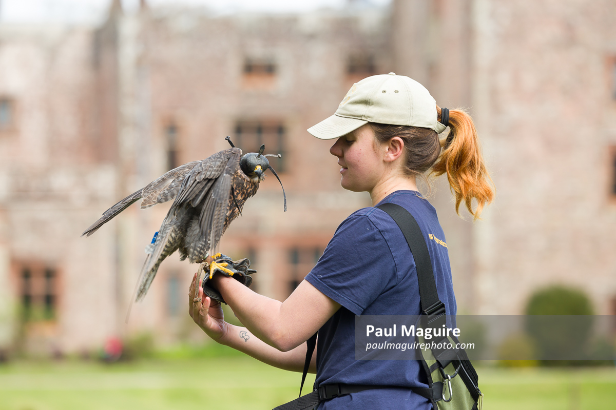 Woman holding a peregrine falcon wearing a hood. Falconry display at Muncaster Castle and Gardens, Cumbria, UK: europe,britain,british,british isles,great britain,uk,england,cumbria,lake district,muncaster,muncaster castle,english,united kingdom,european,estate,garden,gardens,animal,bird,birds,animals,bird of prey,birds of prey,falcon,falco peregrinus,peregrine falcon,falcons,woman,girl,person,people,handler,keeper,falconry,falconer,wearing,hood,display,captivity,in captivity,nature,outdoors,portrait,scene,background,animal portrait,standing,stood,holding,glove,traditional,hunter,hunting,raptor,outdoor,sport,captive,leather,raptors,predator,scenic,landscape,hawk,historic,building,female