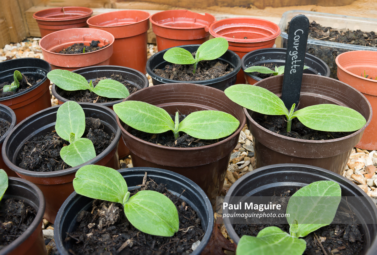 Young courgette plants (zucchini) in pots. Growing vegetable seedlings, UK: courgette,seedlings,growing,courgettes,plants,sowing,vegetables,seeds,pot,pots,flower pot,plant pot,garden,plant,uk,vegetable,gardening,outdoors,zucchini,home grown,young,grow,organic,spring,springtime,grown,planting,soil,food,cultivating,cultivation,seed,outside,homegrown,nobody,horticulture,england,english,planter,plantpot,sprouting,new,beginning,small,green,nature,seedling,sprout,growth,ground,potting,sow,sown,closeup,close up